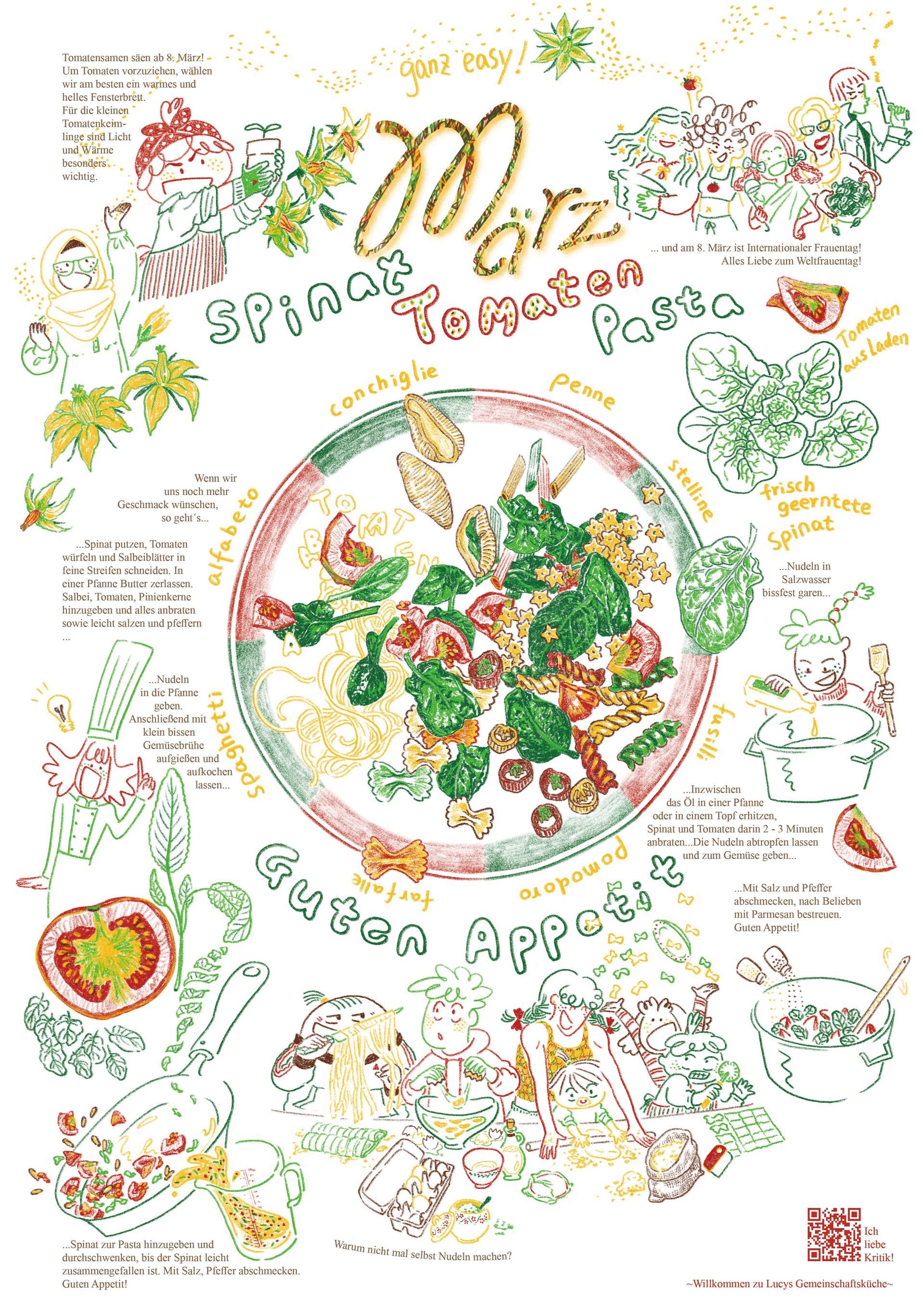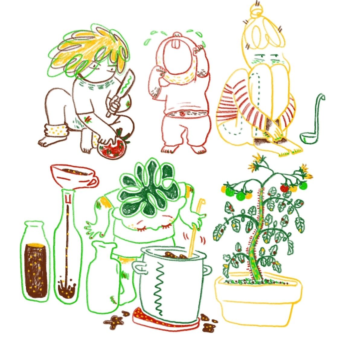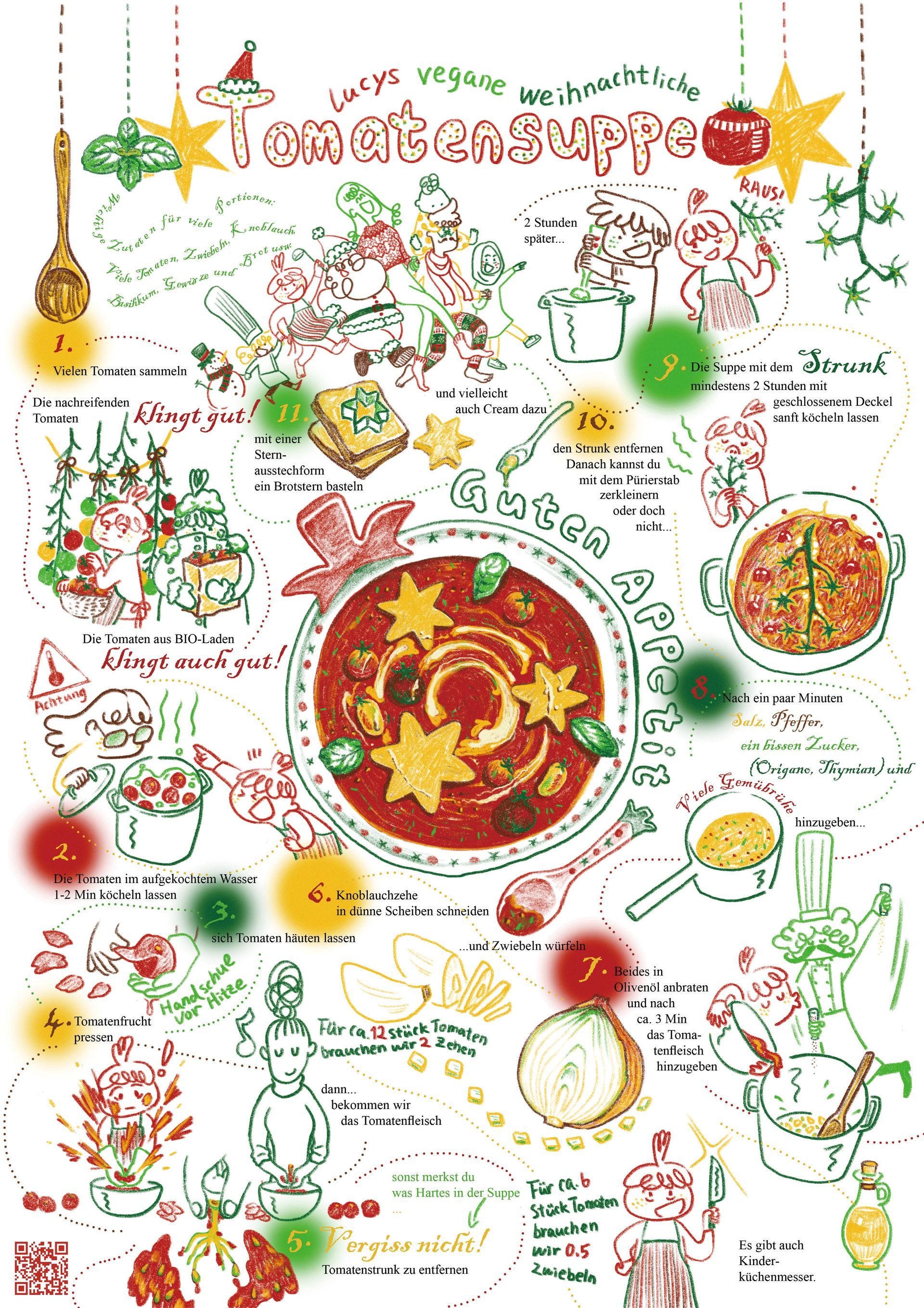 Außer vier von mir selbst genähten Tomaten-Sitzkissen findet man hier auch zwei Wandbilder, die als eine comic-mäßige Tomatenanbauanleitung werken. Wenn man die Bilder genau betrachtet, merkt man, dass der Tomatenanbau außer wichtigem physiologischen Prozess, wie Keimung, Wachstum, Blütenbildung und Fruchtreife nicht vollständig illustriert wird. Eigentlich muss es auch nicht komplett gestaltet werden, man kann ja auch eher nicht komplett schaffen. Mit den Leerstellen werden Kinder eventuell ermutigt, auf ihre Art und Weise die Tomaten anzubauen.